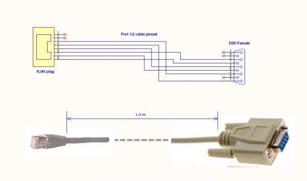 Cable serie RS232 para configuración de equipo TWCT22. Conector RJ45 hacia el equipo y conector DB9 hembra hacia el PC.